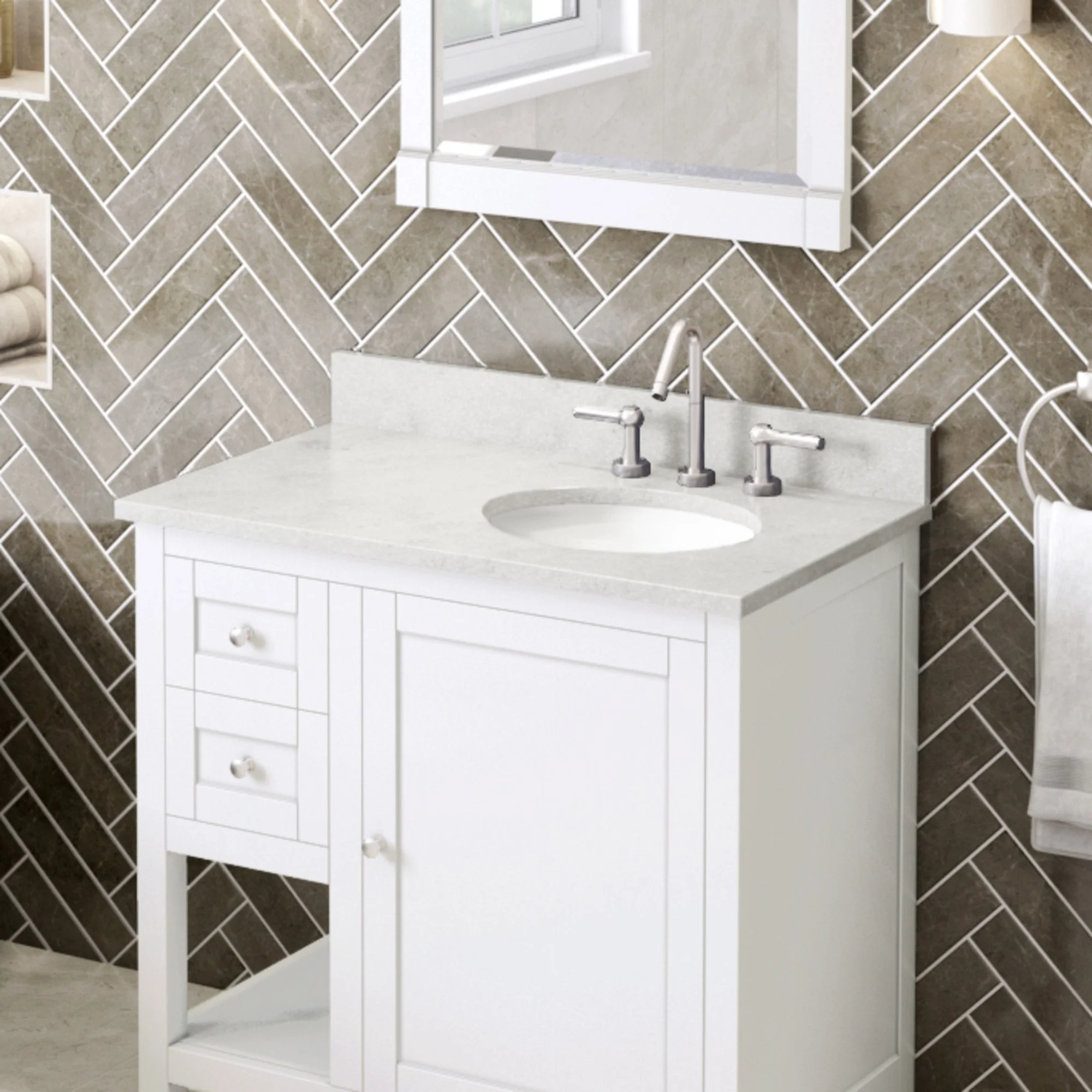 For 36” right offset bowl vanities. 3 holes are cut for an 8” widespread faucet and 4” tall backsplash is included. The countertop side backsplashes are also available for purchase. Designed to overhang ½” on each side of the vanity and is 25 mm thick. Item dimensions: 37” width x 22” depth x 25mm height.